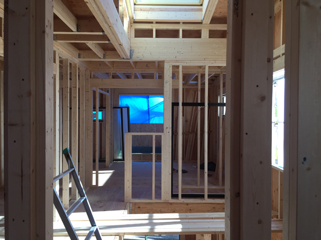 N様邸は、現在大工工事を行っています。断熱材を張り終え、プラスターボード施工中です。