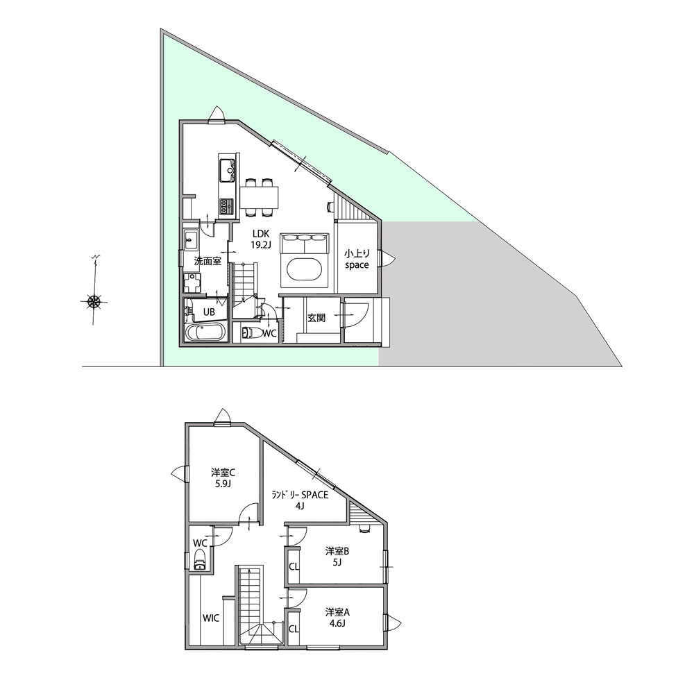 敷地面積 | 124.49㎡(37.65坪) | 建物延床 | 1F:47.68㎡(14.42坪)/2F:50.16㎡(15.17坪)/合計:97.84㎡(29.59坪) |
