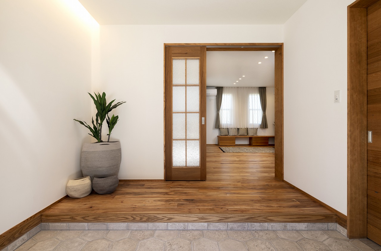 敷地の高低差を生かし、スキップフロアの階段・ビルトインガレージを設けました。